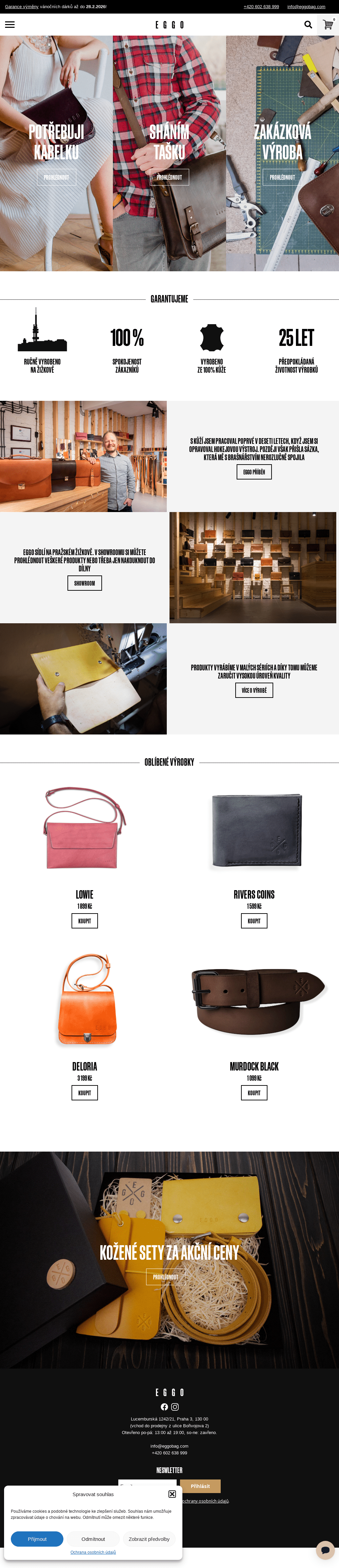 EGGO jsou výrobky z kůže navržené tak, aby Vás provázely po dlouhá léta. Pracuji výhradně s těmi nejkvalitnějšími materiály od lokálních dodavatelů. Všechny usně si sám ručně barvím a všechny mé výrobky jsou dostupné v deseti barvách. Výroba kabelek a všech ostatních produktů EGGO probíhá kompletně v České republice. Veškeré své zboží sám navrhuji a sám je také zhotovuji od začátku až do konce a i díky tomu jsem schopen přizpůsobit výrobek Vašim přáním. Každý kus je neopakovatelným originálem, za kterým jsou skryty hodiny pečlivé práce. Těší mě, když za sebou vidím výsledky, které moji zákazníci ocení. Vzhledem k náročnosti výroby produkuji kožené doplňky v omezených sériích, což každému kousku dodává na jedinečnosti.