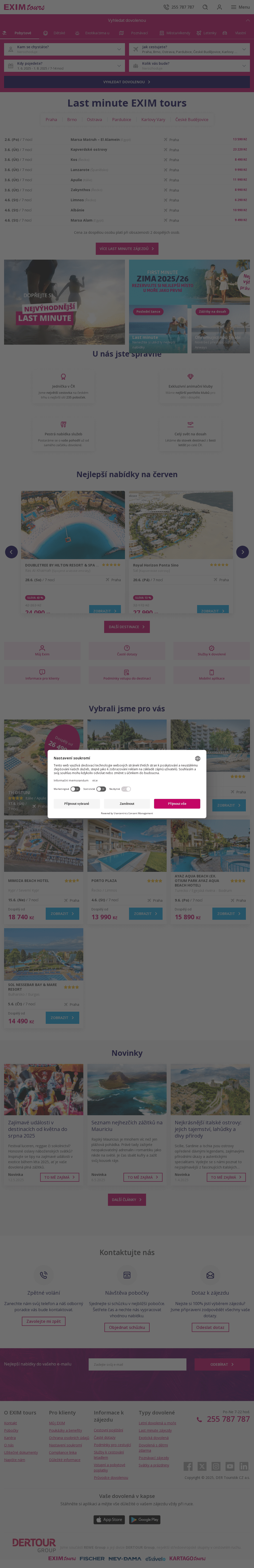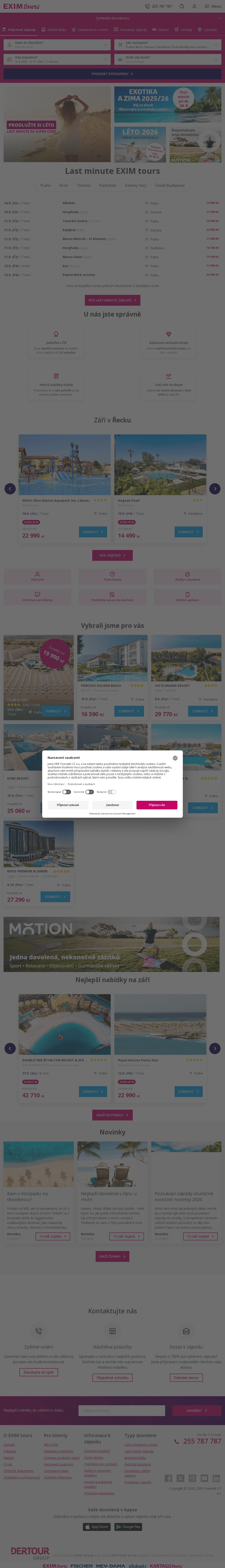 EXIMtours patří mezi největší cestovní kanceláře na českém trhu. Nabízí pobytové a poznávací zájezdy, last minute, exotiku, eurovíkendy, lyžování i letenky. Využijte skvělé lastminute zájezdy.