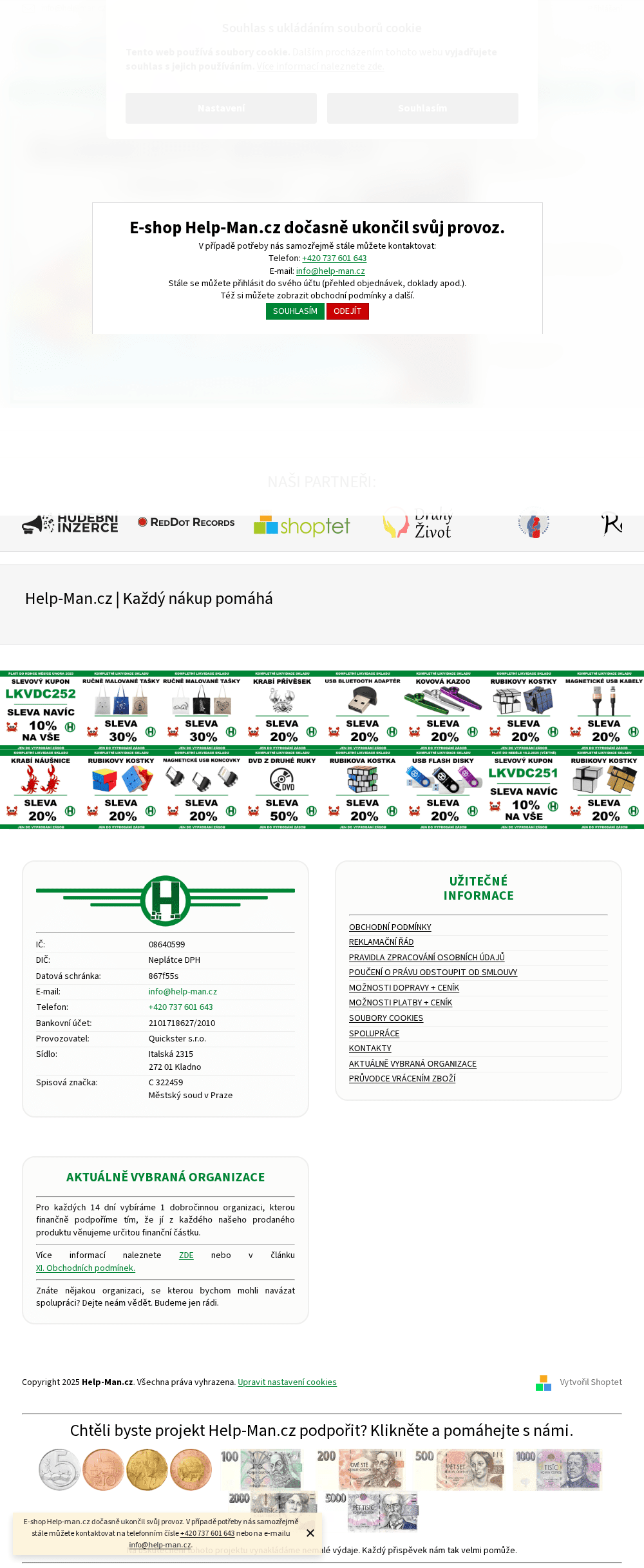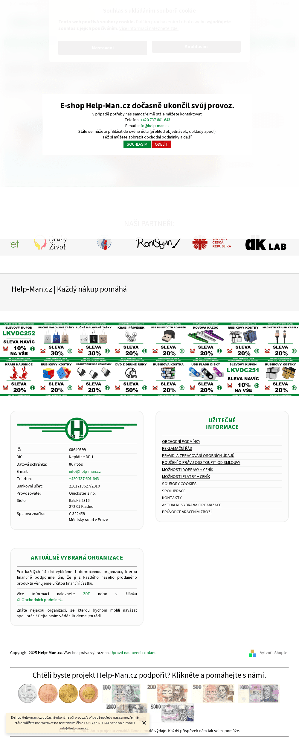 V Česku působí plno dobročinných organizací. Některé jsou čistě české, jiné jsou mezinárodní. Některé z nich mají svůj malý e-shop na svých stránkách. Help-man tyto všechny organizace sdružuje pod jeden e-shop.