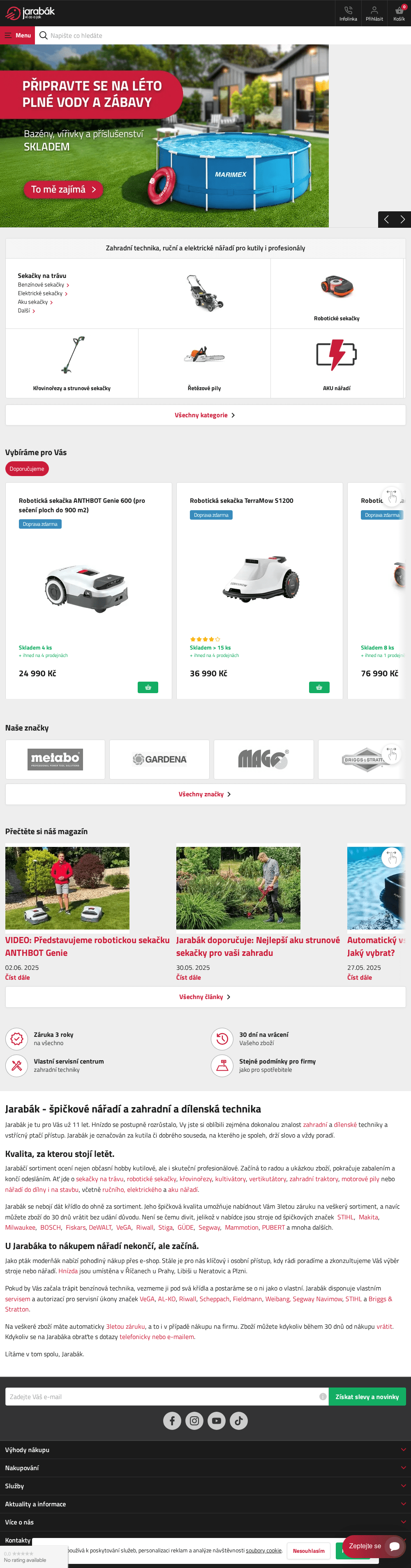 Ryze český významný prodejce zahradní techniky, vybavení do dílny a stavebního nářadí. Za výhodné ceny nabízí spolehlivé zahrandí stroje, odolný zahradní nábytek či robotické pomocníky pro dům i zahradu. Dále také široký sortiment ručního nářadí, aku nářadí a také bazenů a bazénového příslušenství. Pro děti u nás najdete odrážedla, šlapadla, čtyřkolky či doplňkové prvky pro dětská hřiště. Sortiment doplňuje kategorie Auto-Moto.