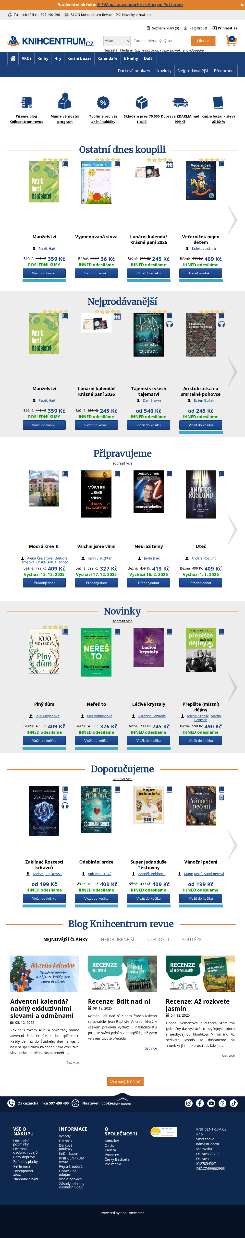 KNIHCENTRUM.cz je internetové knihkupectví s rozsáhlým sortimentem knih, rychlou expedicí a výhodnými cenami. V nabídce knihkupectví naleznete beletrii pro děti a dospělé, komiksy, učebnice, odbornou literaturu, encyklopedie, příručky, mapy, kalendáře, audioknihy, deskové hry i doplňkový sortiment. Knižní novinky i bestsellery jsou zde v prodeji za velice výhodné ceny, levné knihy se slevami až 90%. Při nákupu nad 500 Kč je doprava zdarma.