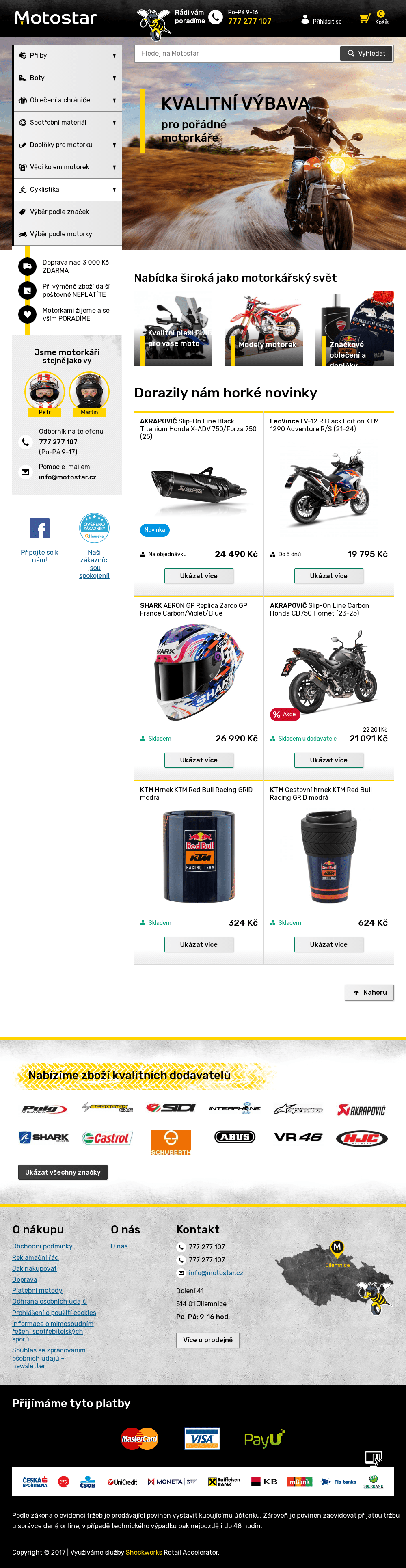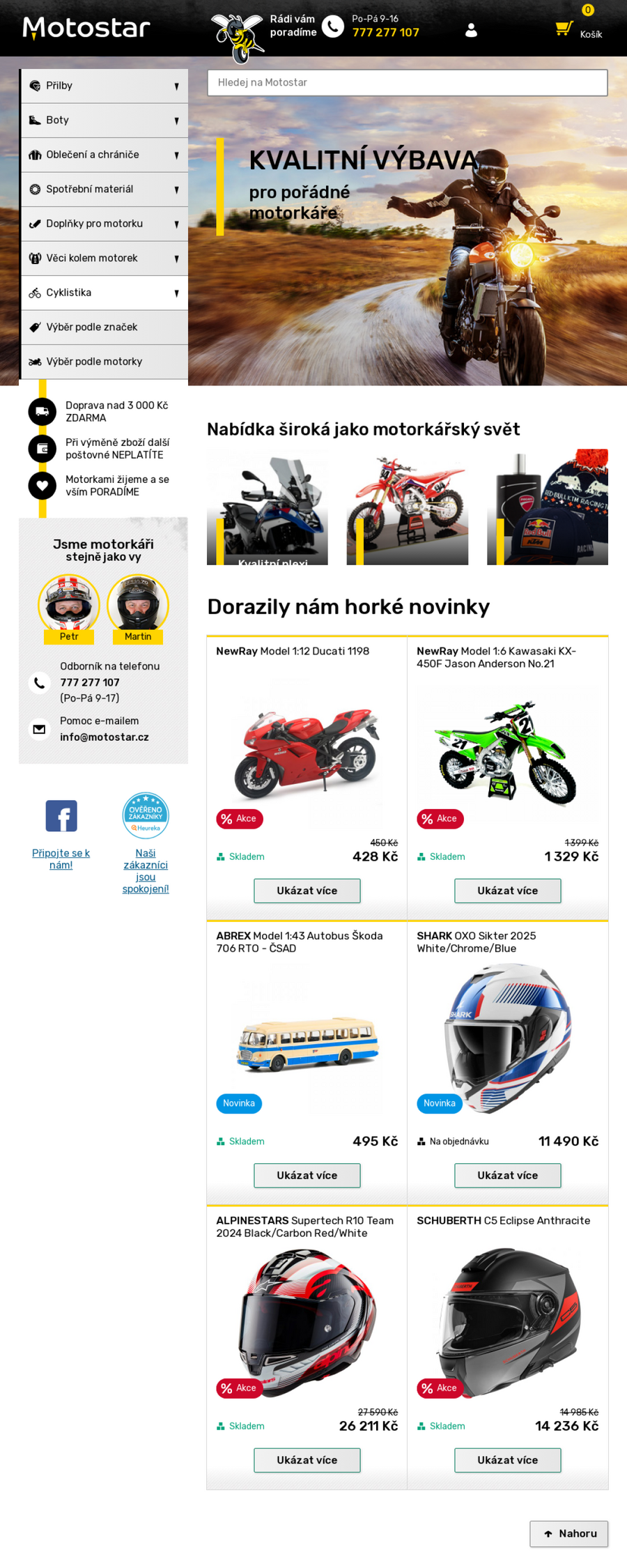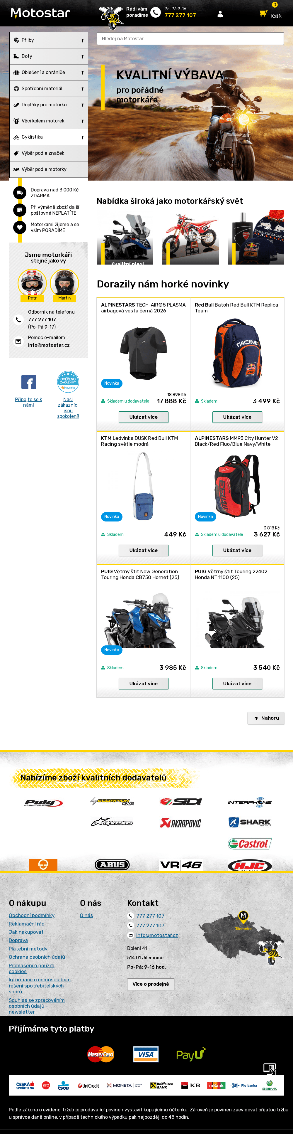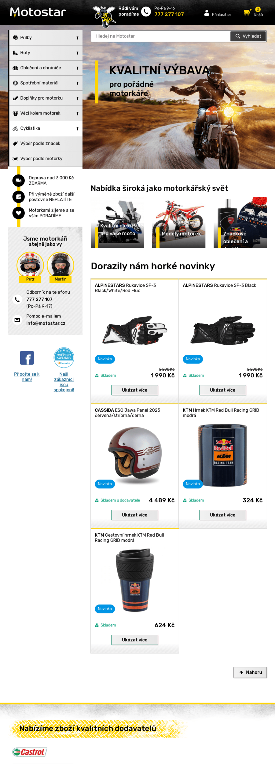 Prodáváme vše pro motorky. Nabízíme výstroj (boty, helmy, oblečení), oleje, motokosmetiku, filtry, náhradní díly, baterie, plexi štíty, elektroniku, pneumatiky. Výběr ze značek jako Alpinestars, Sidi, Shark, HJC, Schuberth, Motul, Castrol, Dunlop, KN, Scott.