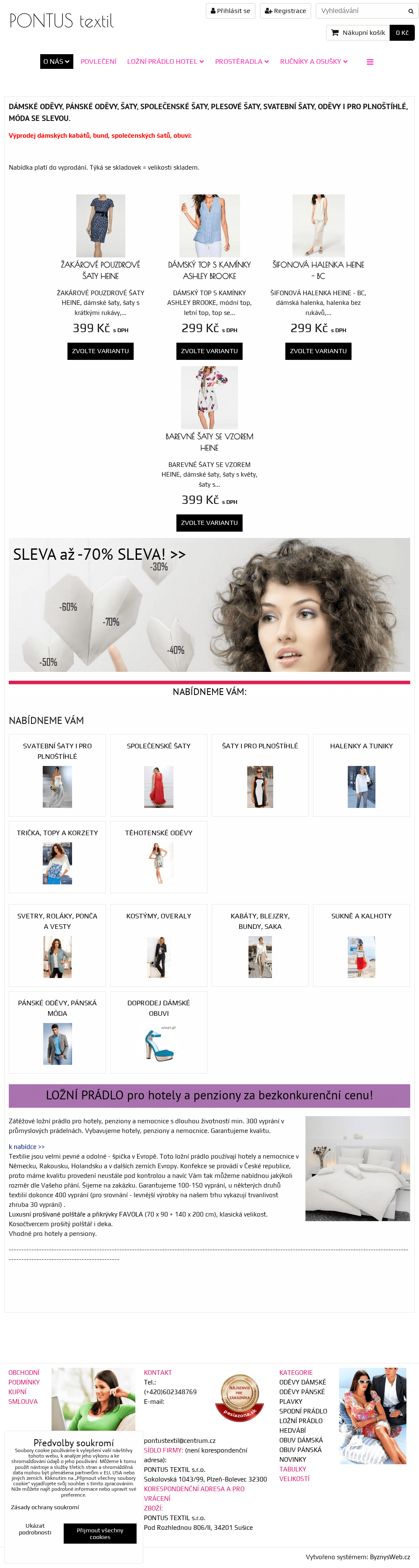Značková móda levně! Společenské šaty, halenky, kabáty, kostýmy, kabelky od APART, HEINE, VERSACE, PRADA, D&G, LAURA SCOTT, svatební šaty. Spodní prádlo luxusní i sportovní dámská a pánské (GINA, GINO, DANIELA,), zátěžové ložní prádlo pro hotely a nemocnice s dlouhou životností, malované hedvábí, plavky a další....