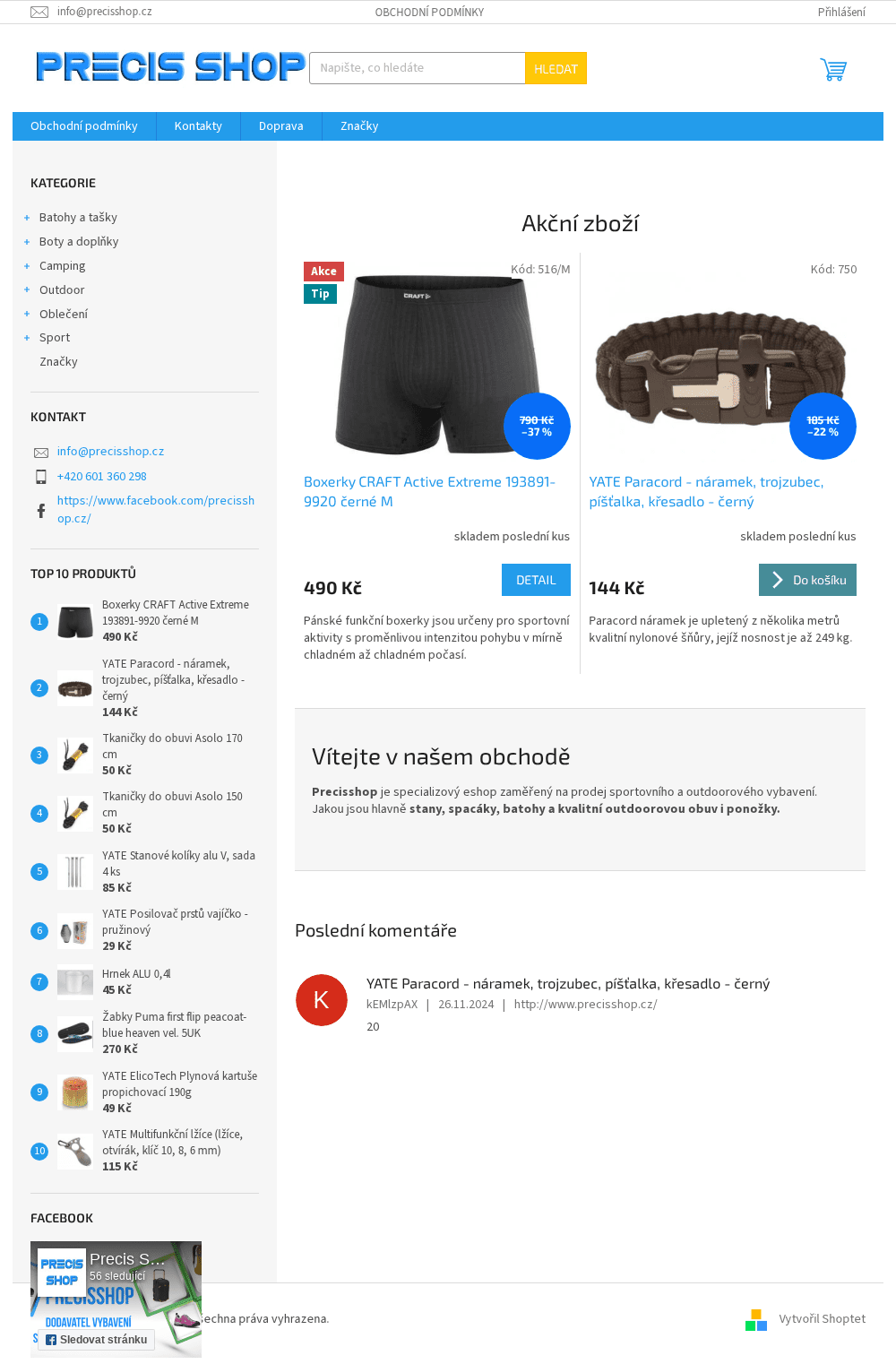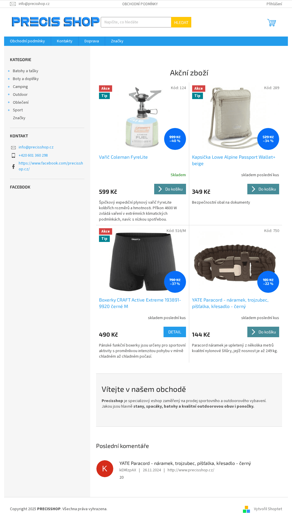 Precisshop se zabývá prodejem outdoorových a sportovních potřeb. Na eshopu naleznete boty, stany, spací pytle, batohy, ponožky atd. Výběr zboží značek Puma, Asolo, Campingaz, Coleman, Lowe Alpine aj.