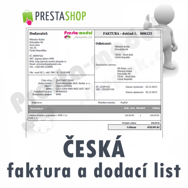 * [MODUL] ČESKÁ FAKTURA A DODACÍ LIST 1.5.X (připraven i na verzi 1.6.)* [MODUL] DOBÍRKA S POPLATKEM + DPH 1.5.X (připraven i na verzi 1.6.)* [MODUL] ONLINE PODÁNÍ ČESKÁ POŠTA, PPL A GLS (EXP/IMP CSV) 1.5.X (připraven i na verzi 1.6.)* [MODUL] PLATEBNÍ BRÁNA GOPAY 1.5.X (připraven i na verzi 1.6.).Vytvoříme Vám váš e-shop v systému PrestaShop. Pokud uvažujete o vlastním e-shopu a netroufáte si na jeho rozjezd (instalaci), obraťte se na nás. Vytvoříme Vám váš e-shop na míru v systému PrestaShop a na Vás už jen bude si do vašeho připraveného funkčního e-shopu vložit vaše produkty a začít prodávat. |