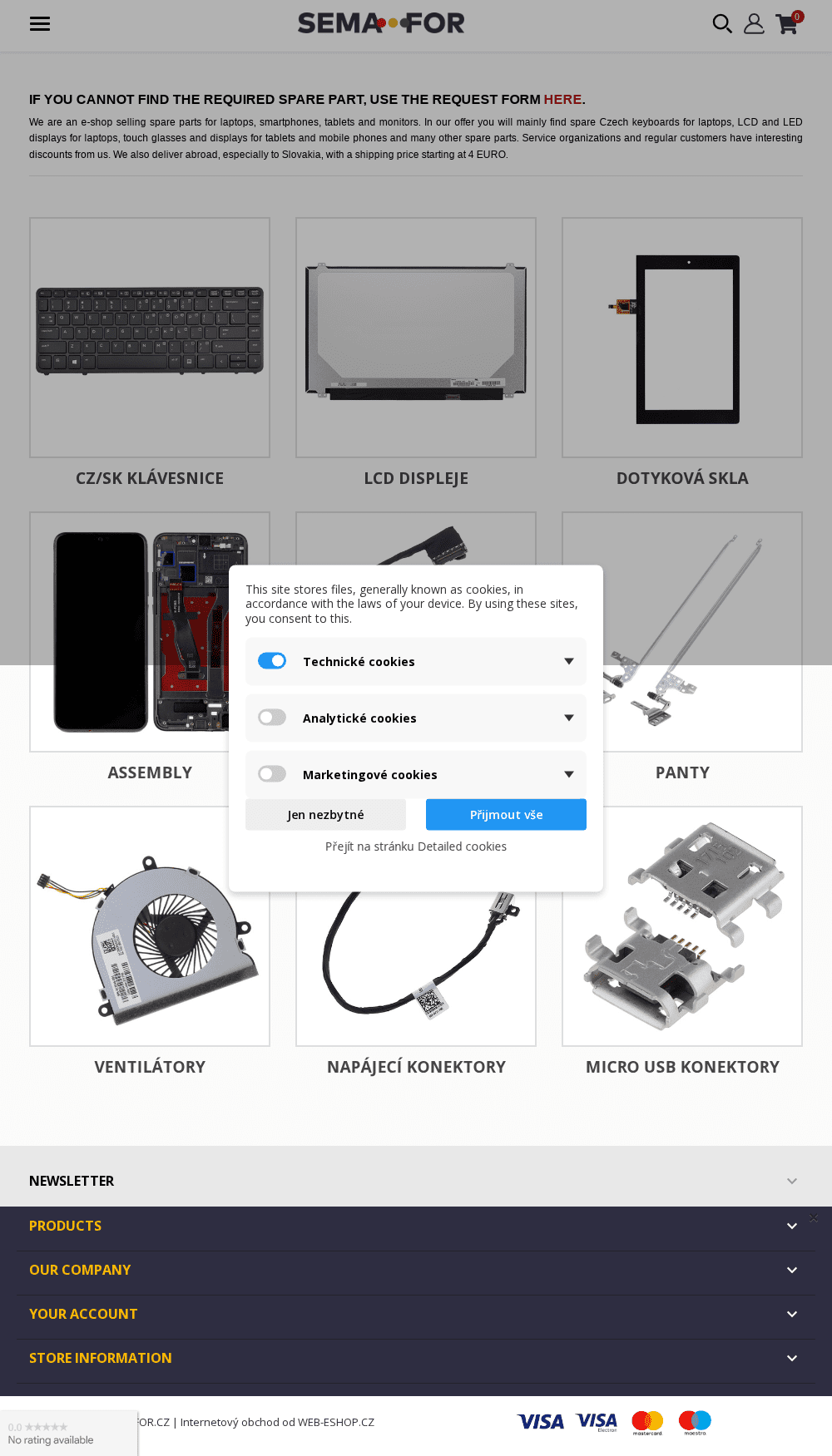 Velkoobchod a maloobchod s náhradními díly pro notebooky, tablety a chytré telefony, elektronickými součástkami, zdroji a nejrůznějším příslušenstvím. Nabízíme široký sortiment displejů, dotykový panelů, klávesnic, pantů, konektorů, ventilátorů, kabelů, invertorů, tlačítek a dalších dílů.