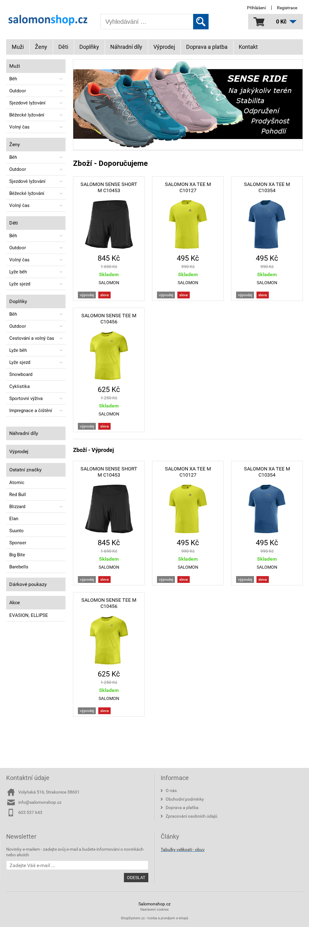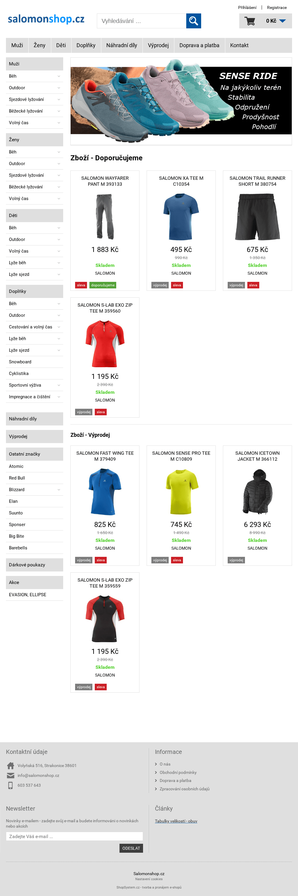 Obchod Salomonshop nabízí širokou škálu zboží výhradně od značky Salomon. Salomon vznikl v roce 1947 v srdci Francouzských Alp - rodišti moderního alpinismu. Dnes se produkty s logem Salomon prodávají ve níce než 160 zemích a značka jako taková se stala globálním pojmem. Salomon přináší design a inovace do horského prostředí, přetváří nové myšlenky ve skutečnost a rozšiřuje hranice možností.