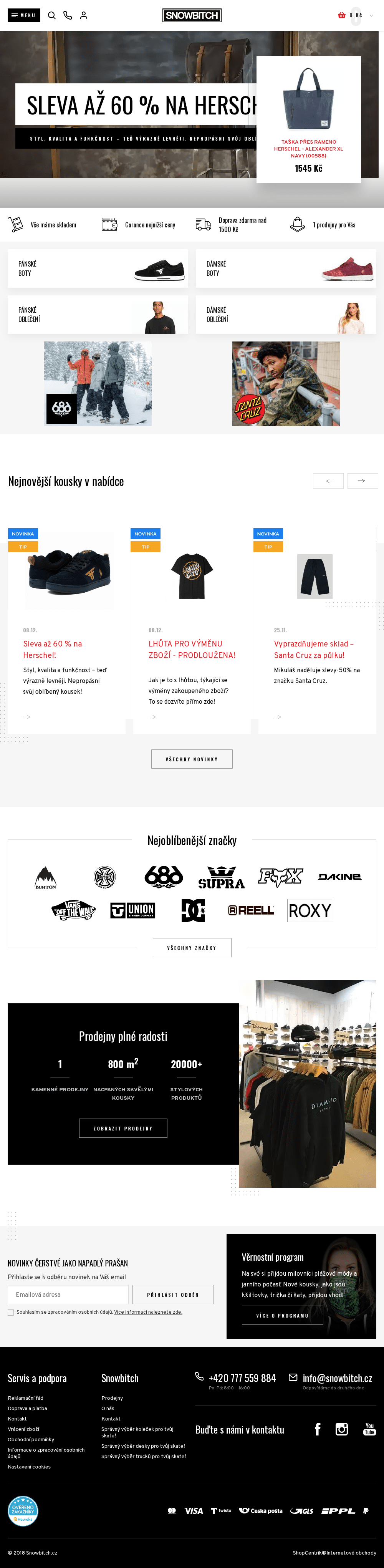 Snowbitch.cz je špičkový skateshop a snowboard shop, kde najdete veškerou výbavu na skate, nebo na snowboarding. Kvalitní prkna, vázání a obuv, ale také bundy, kalhoty a lyžařské helmy a spousta dalšího vybavení, které nesmí chybět žádnému snowboardistovi. Snowboard shop Snowbitch nabízí prkna značek Nidecker, Burton, nebo třeba Gravity. Skate a snow oblečení všech vašich oblíbených značek, jako je Quiksilver, Roxy, Bench, Horsefeathers nebo Vans. Nesmí chybět ani skate boty DVS, Adio, Fallen a mnoho dalších značek. Obleč se na Snowbitch od hlavy až k patě a pořiď si ještě k tomu parádní zimní výbavu na snowboard.