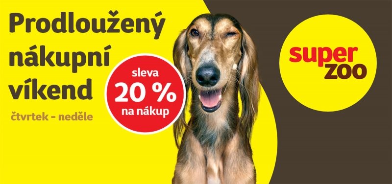 Užijte si prodloužený nákupní víkend na SUPERZOO se slevou 20 % při nákupu alespoň za 500 Kč. Po zadání slevového kódu SLEVA20 vám odečteme 20 % z ceny vašeho nákupu.