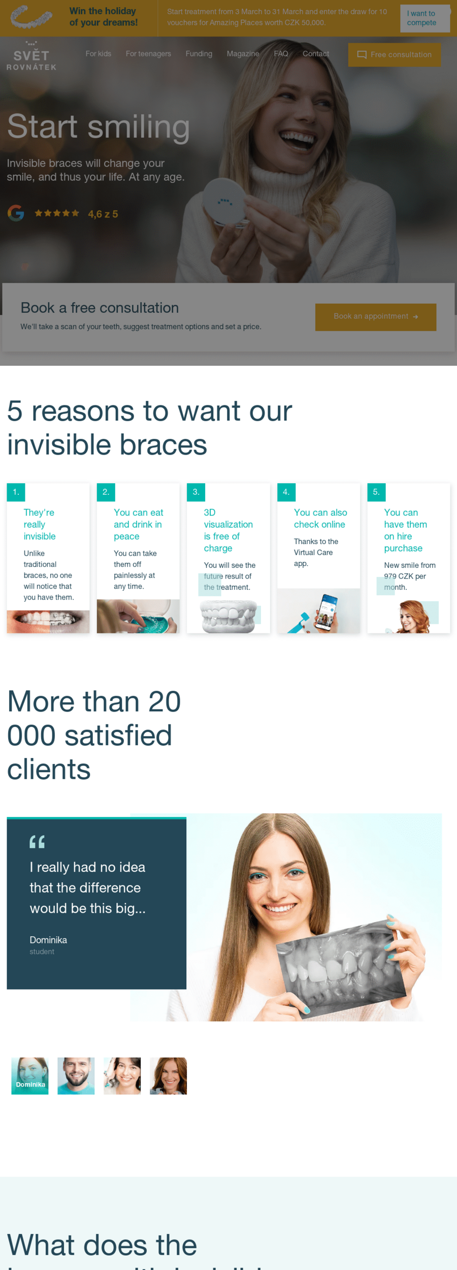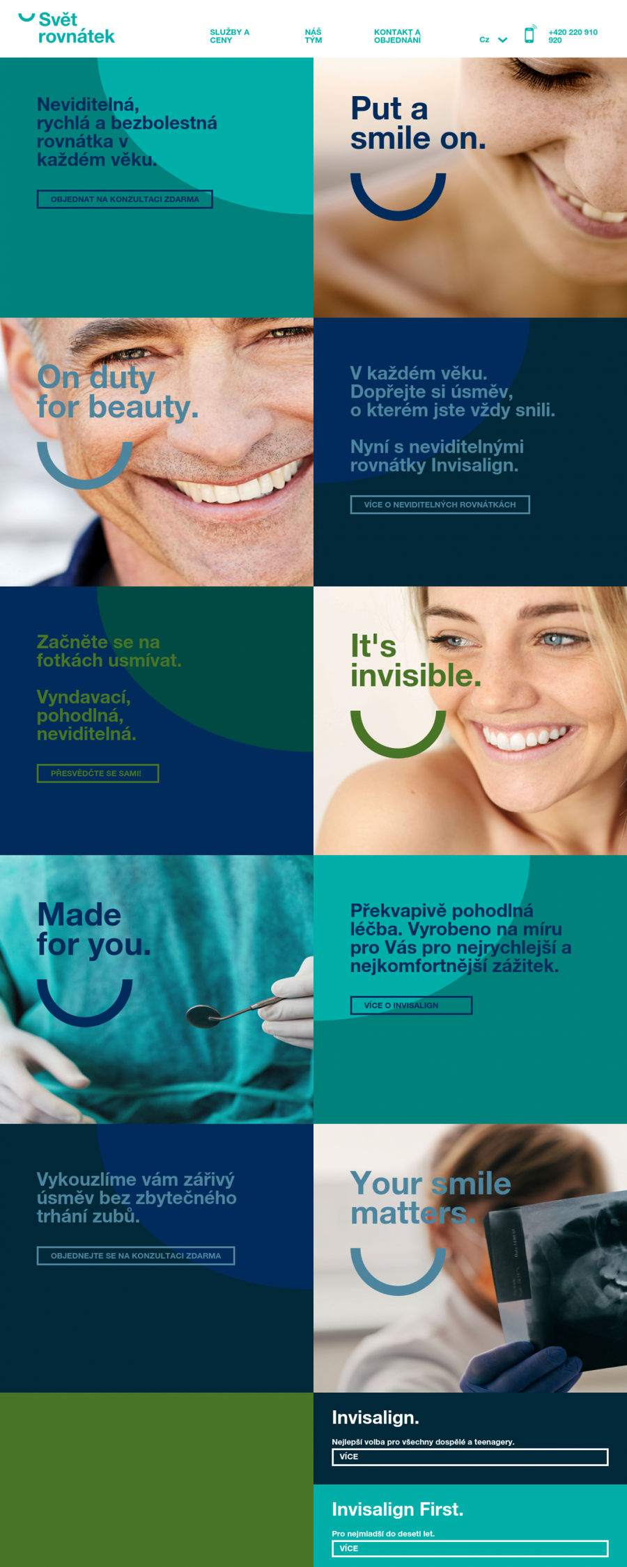Svět rovnátek je největší a nejzkušenější ortodontická klinika na světě. Prioritou je perfektní úsměv a splněná přání pacientů. Z tohoto důvodu Vám přináší také dokonalou rovnováhu a symetrii obličeje z rukou estetických lékařů. Využít můžete bělení zubů, rovnátka Invisalign First pro děti do 10 let nebo lingvální rovnátka na vnitřní straně zubů pro absolutní neviditelnost.