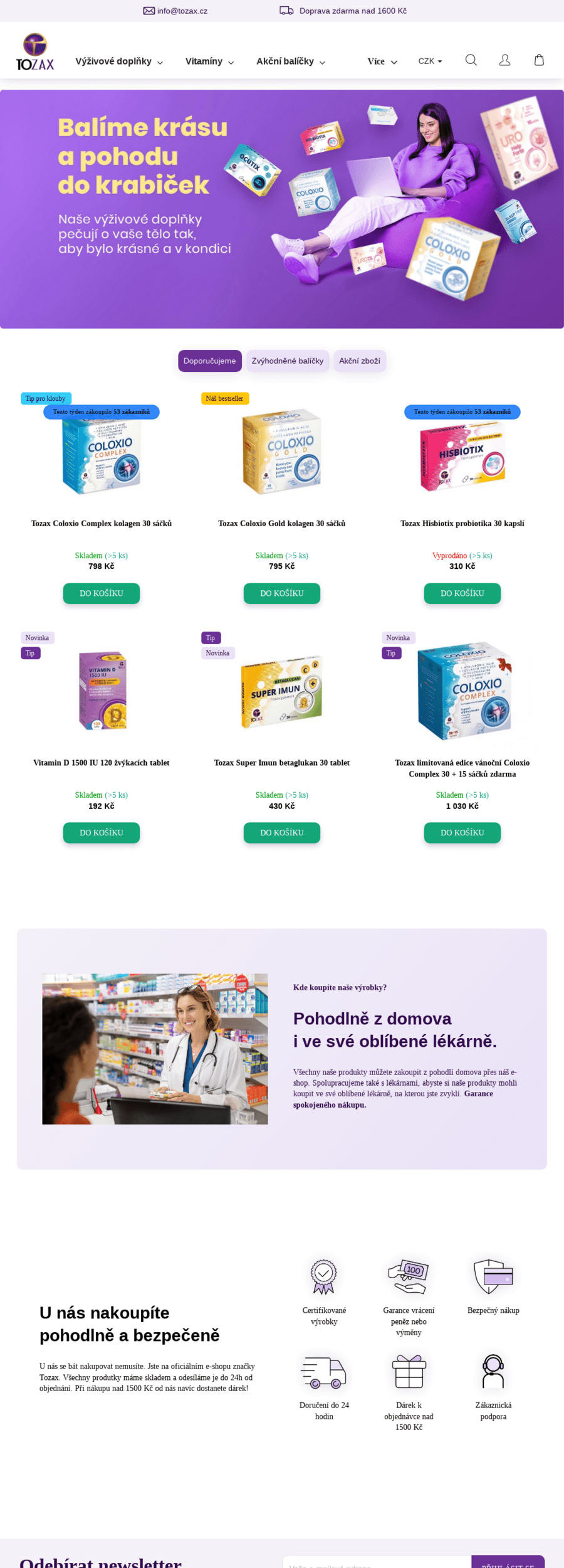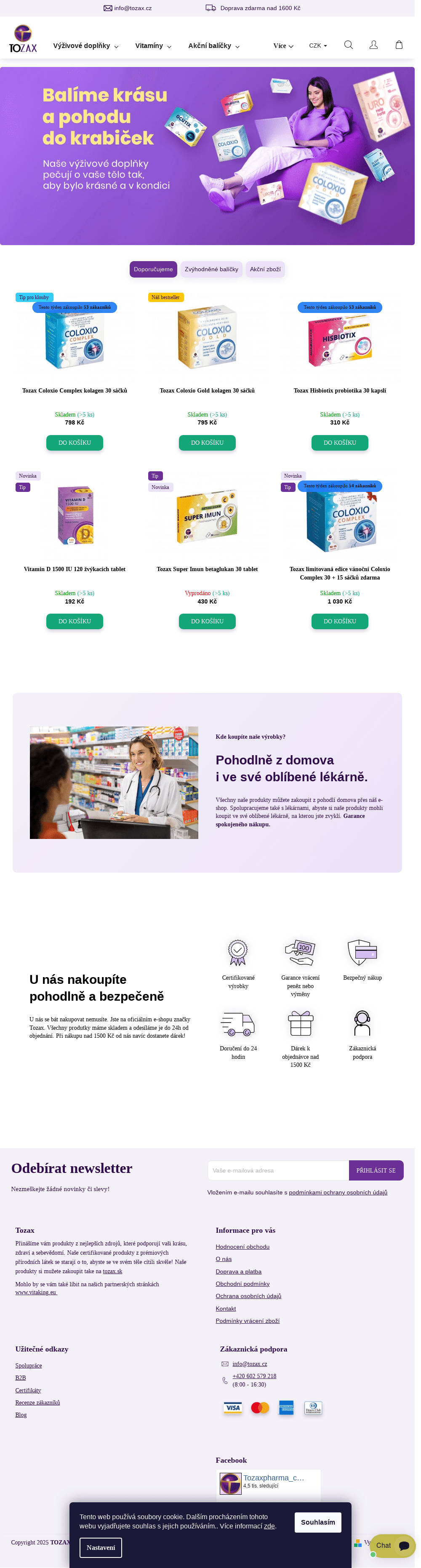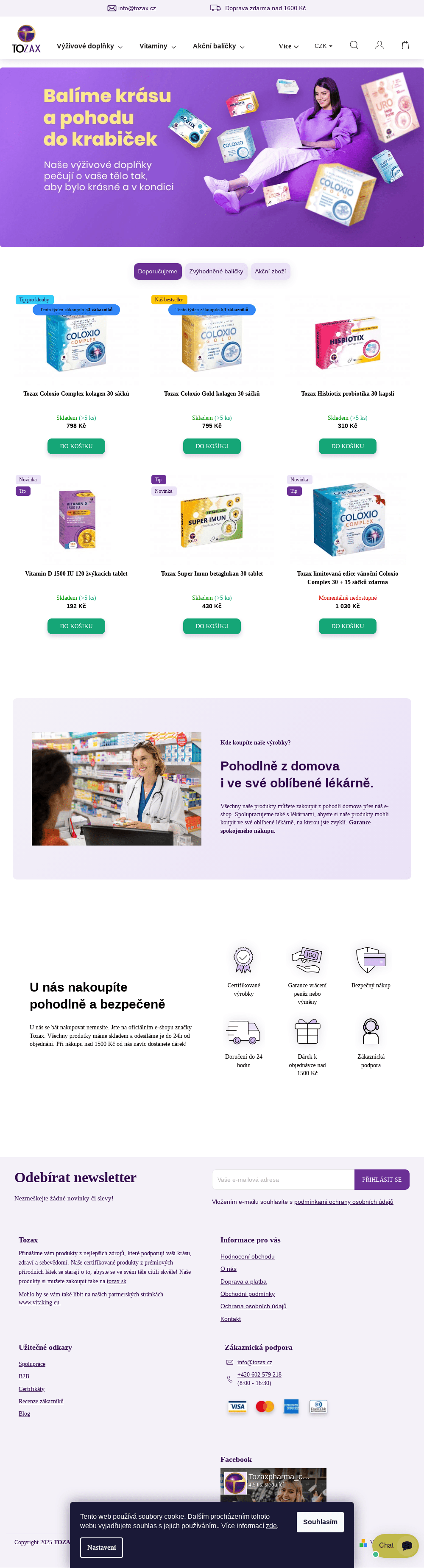 Certifikované doplňky stravy pro podporu zdraví a krásy s šetrným složením a bez přidaných cukrů, barviv a lepku. Výživové doplňky Tozax jsou ideálním řešením pro doplnění potřebných látek, které tělo nedokáže produkovat v dostatečném množství nebo o ně přišlo následkem nemoci.