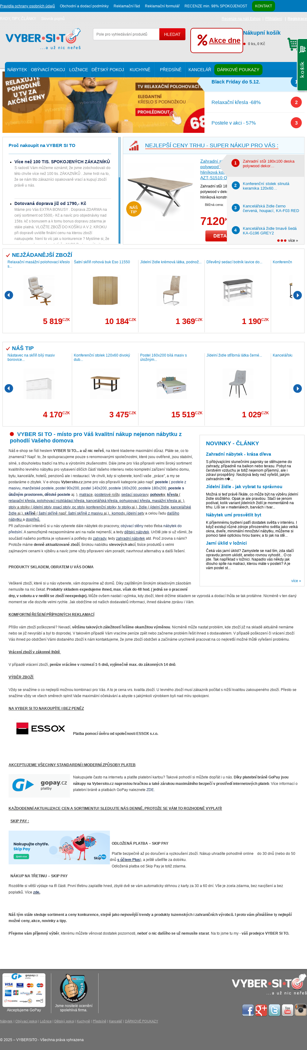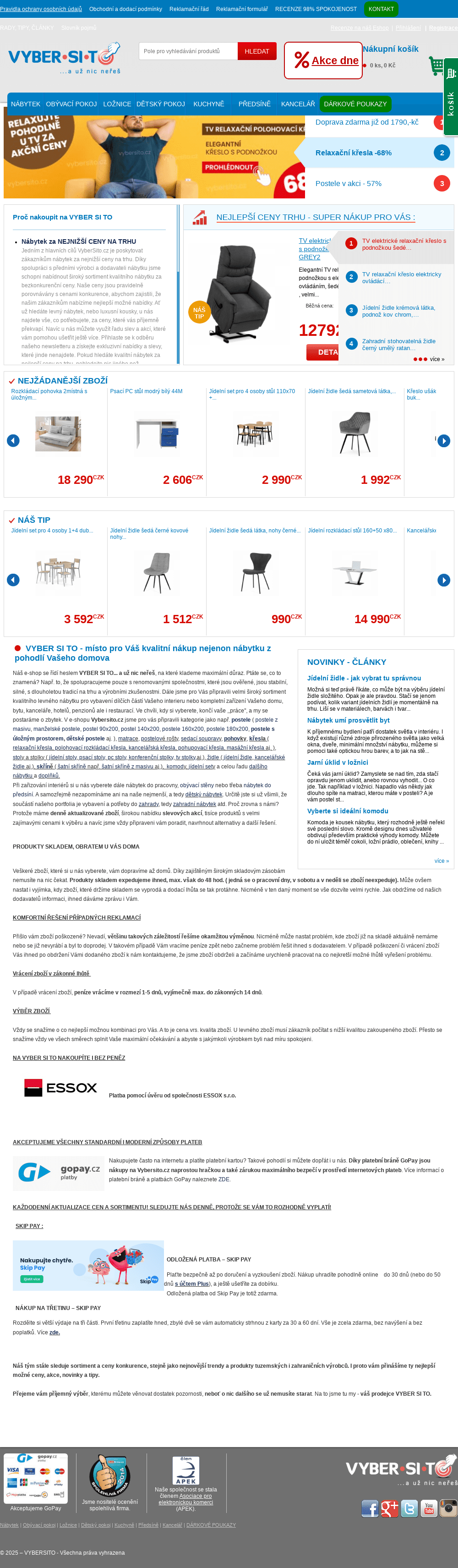 E-shop Vybersito.cz nabízí nábytek do celého interiéru. Najdete zde široký výběr z kategorií postele, matrace, skříně, šatní skříně, obývací stěny, komody, sedací soupravy, konferenční stoly, pc stoly, psací stoly, pohovky, jídelní stoly, jídelní židle, jídelní sety ( stůl a židle ), kancelářské židle, dětský nábytek, studentský nábytek a dalšího nábytkového vybavení. Kromě toho si zde můžete pořídit nábytek a vybavení do zahrady.